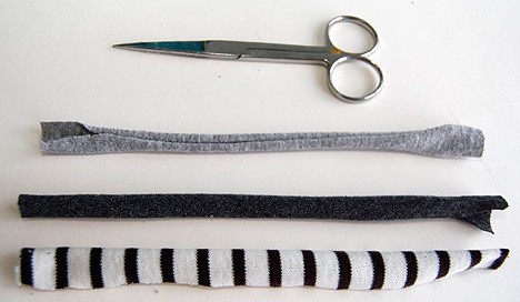 1. Cut 3 strips of t-shirt fabric. One inch is a good width to work with. Length wise, they should be the length of your wrist PLUS 3 inches or so. It’s better to make them too long than too short! Gently tug at the strips so that the edges curl up neatly.