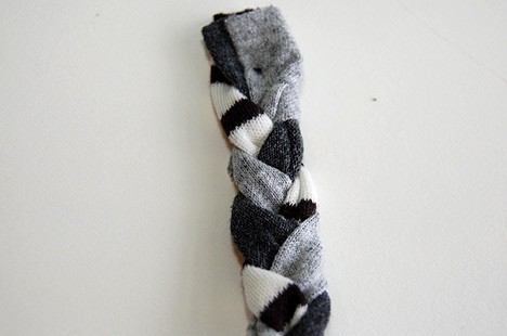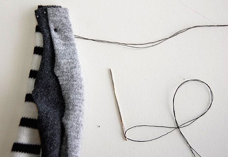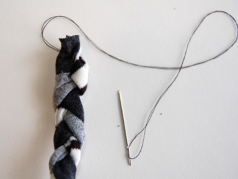 2. Stack the ends of the 3 strips on top of one another, and stitch a few times to secure them together.