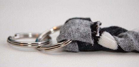 6. Insert one end through one key ring. Fold over and secure with hot glue.